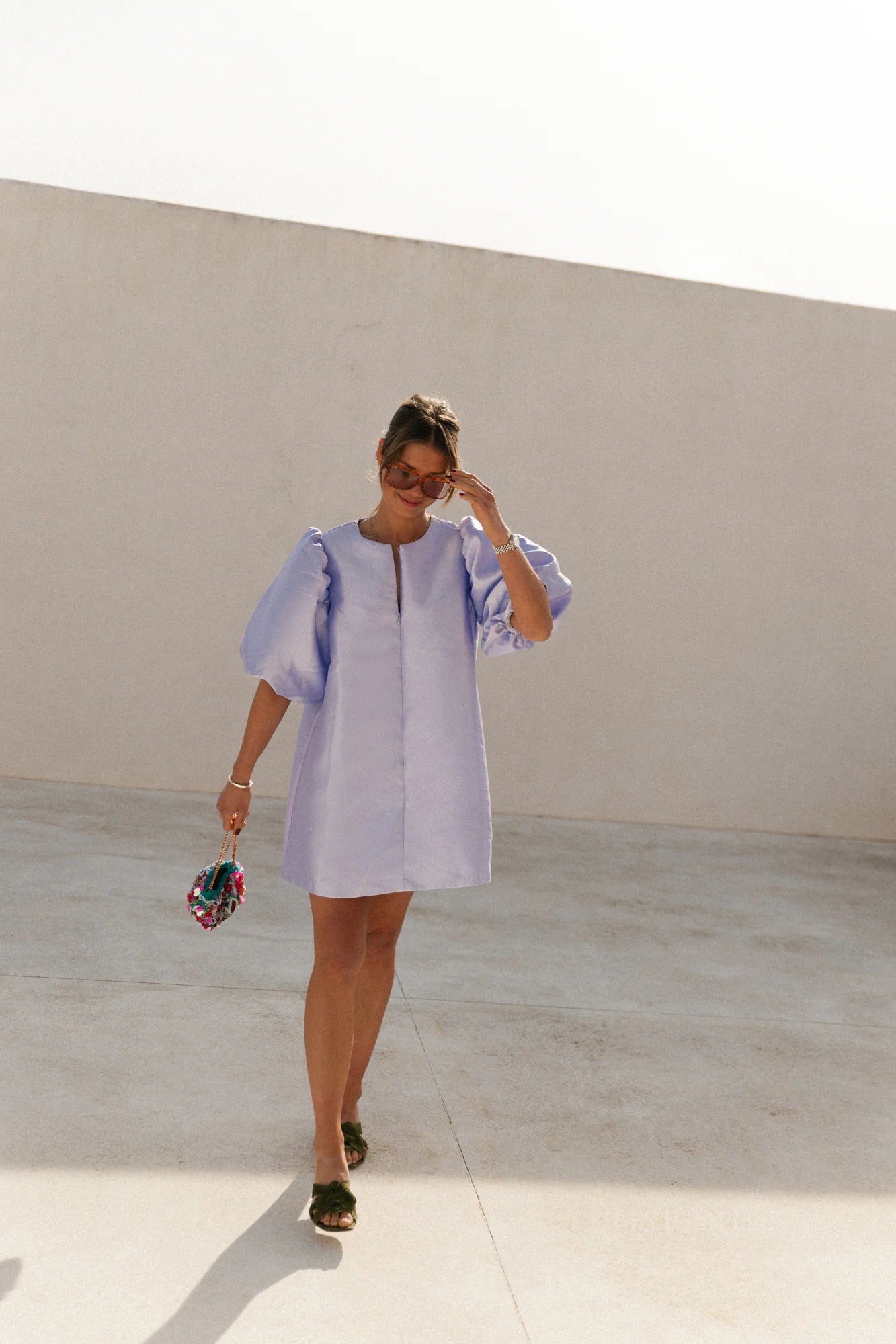 Say hello to our Charlotte dress, a true showstopper from our new collection! Designed with a luxurious, subtly shiny fabric, this dress combines effortless elegance with a modern twist. The voluminous sleeves, with their delicate gathered details, add a playful yet sophisticated flair, while the clean silhouette and front zipper closure create a sleek and contemporary finish.