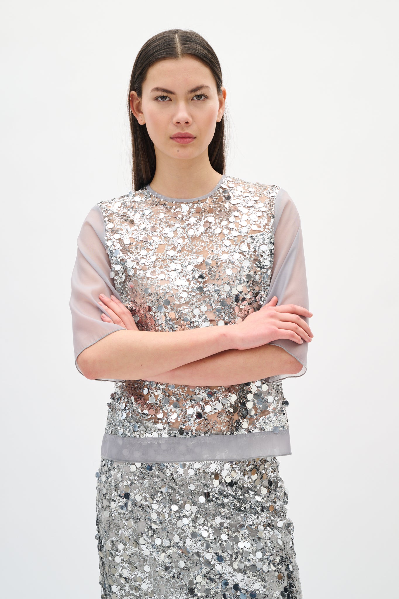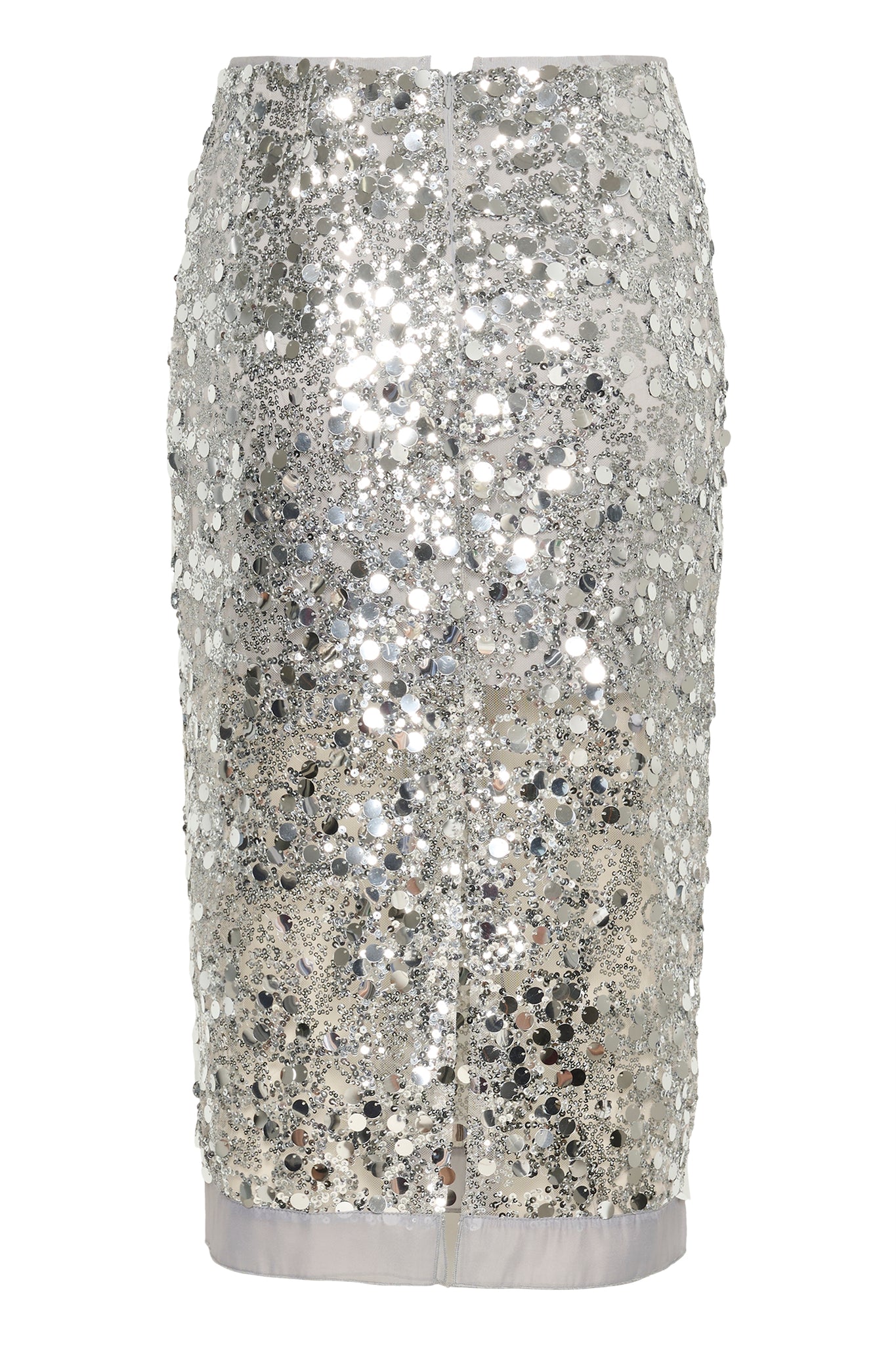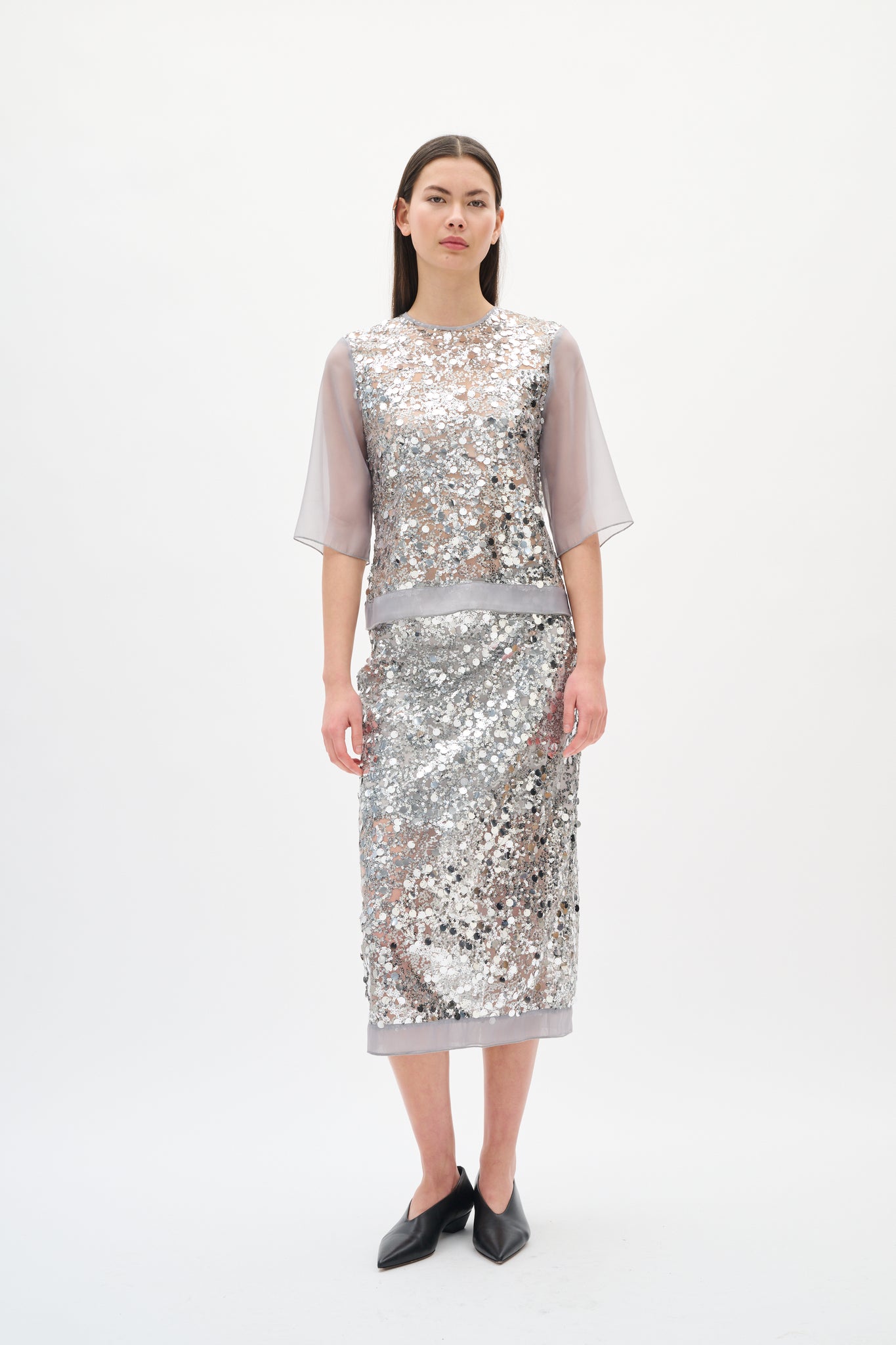 This straight-fit sequin skirt stands out with full shimmering disc embellishments and a subtle sheer trim at the hem. Midi length with a concealed back zip.