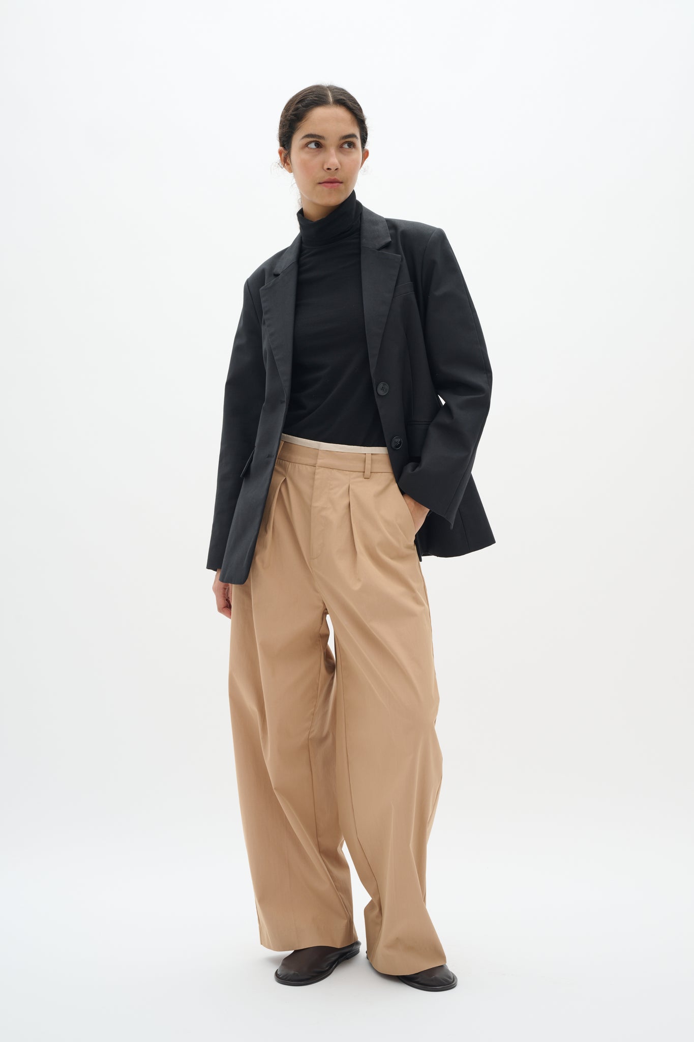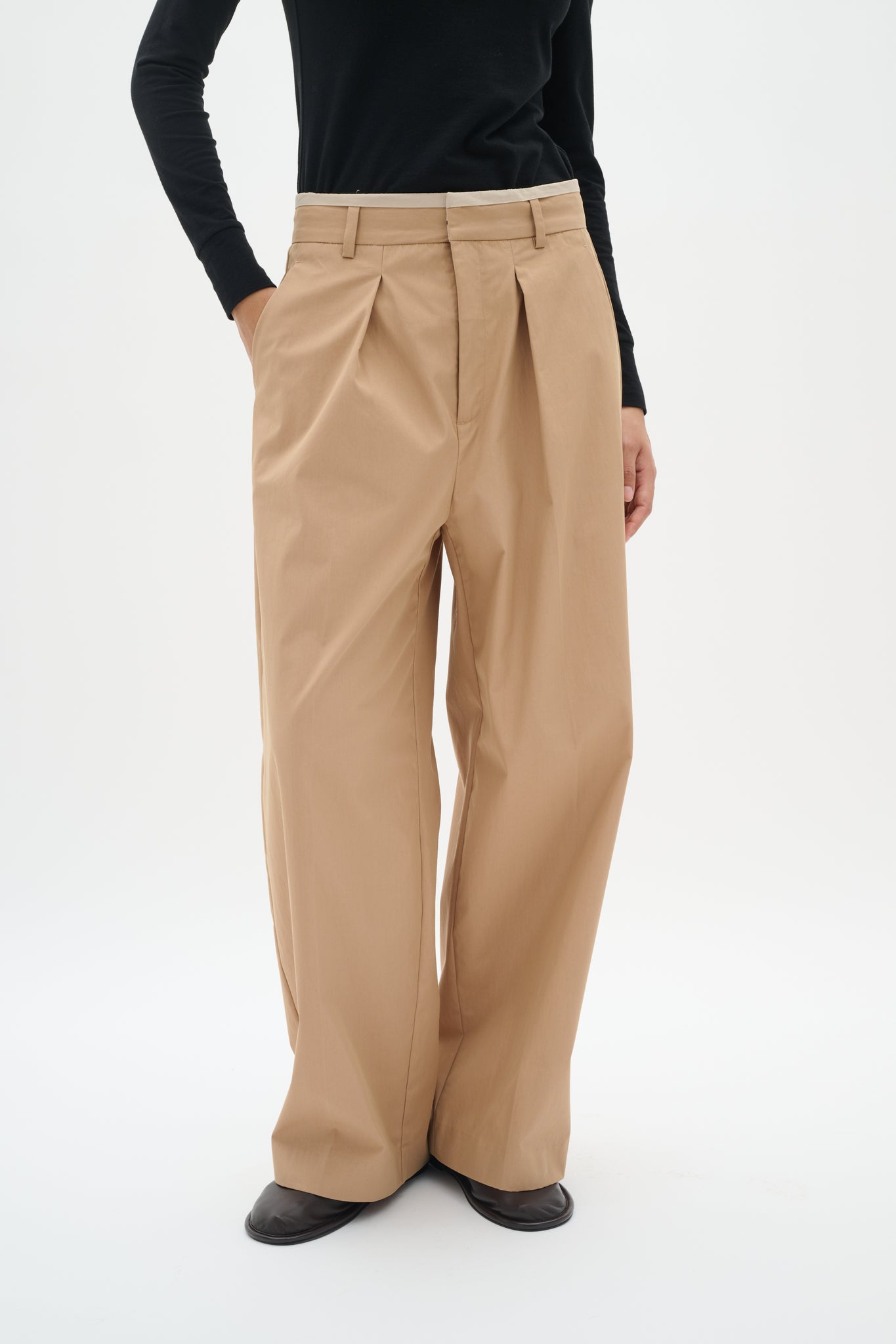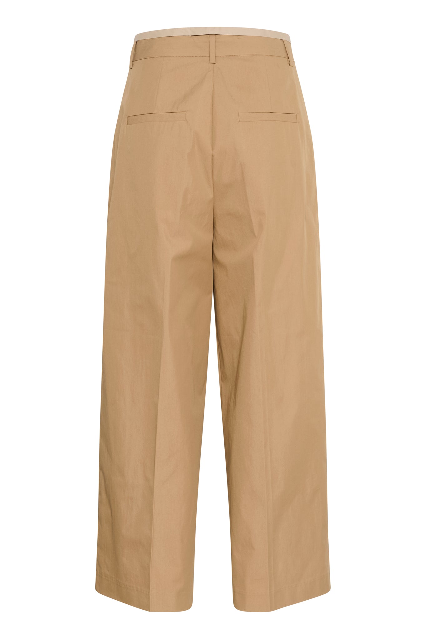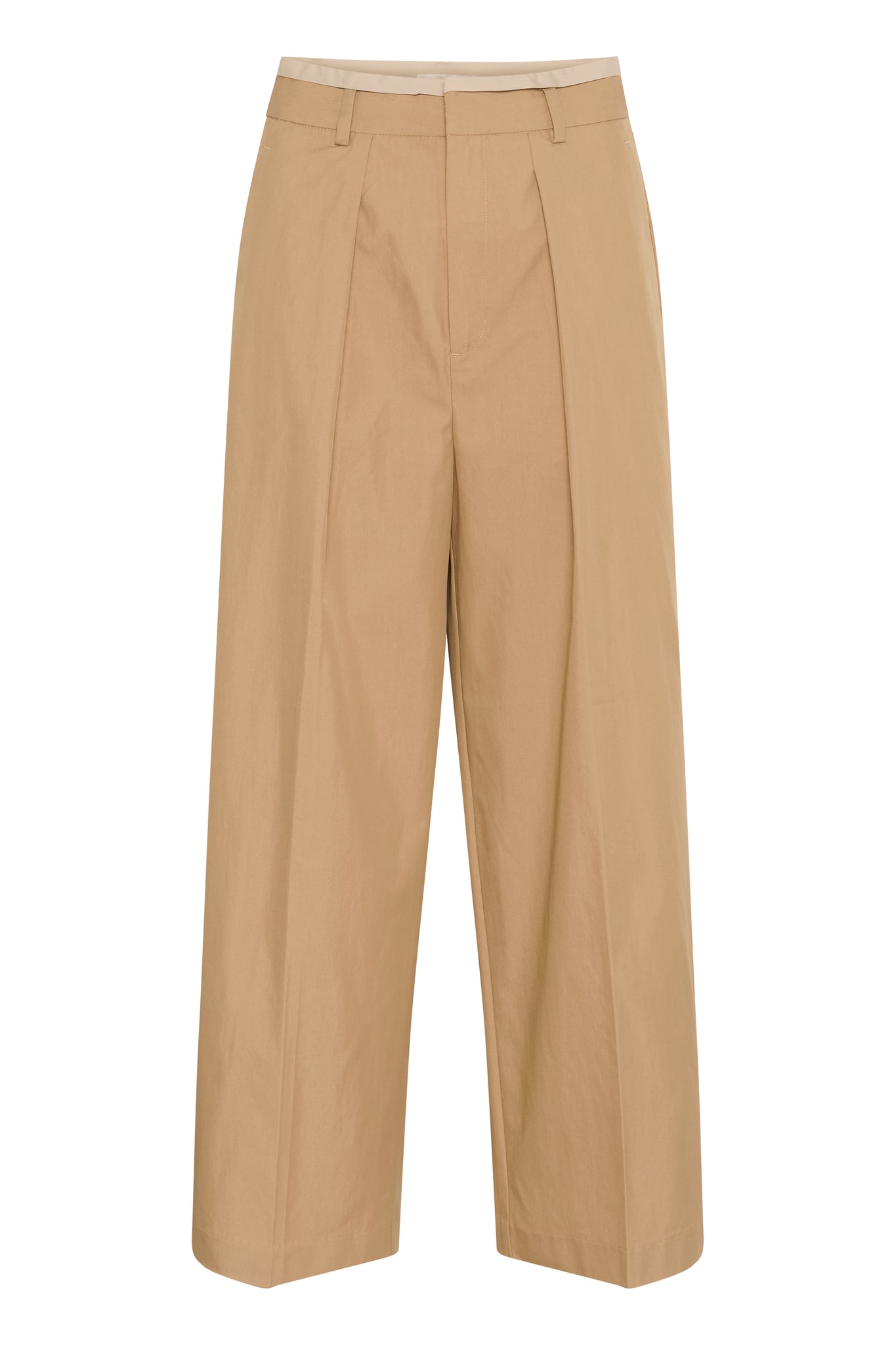 Wide leg trousers feature a structured straight fit, crisp front pleats, and a classic waistband with belt loops. The ankle-grazing length delivers a modern, tailored silhouette with a clean, flat front profile.
