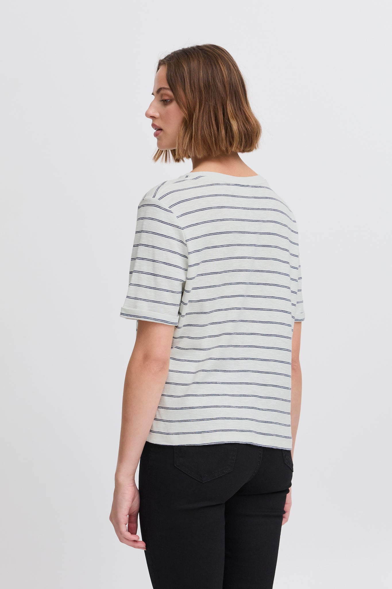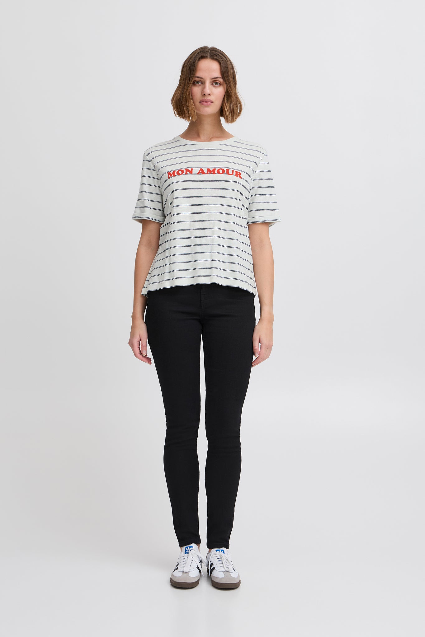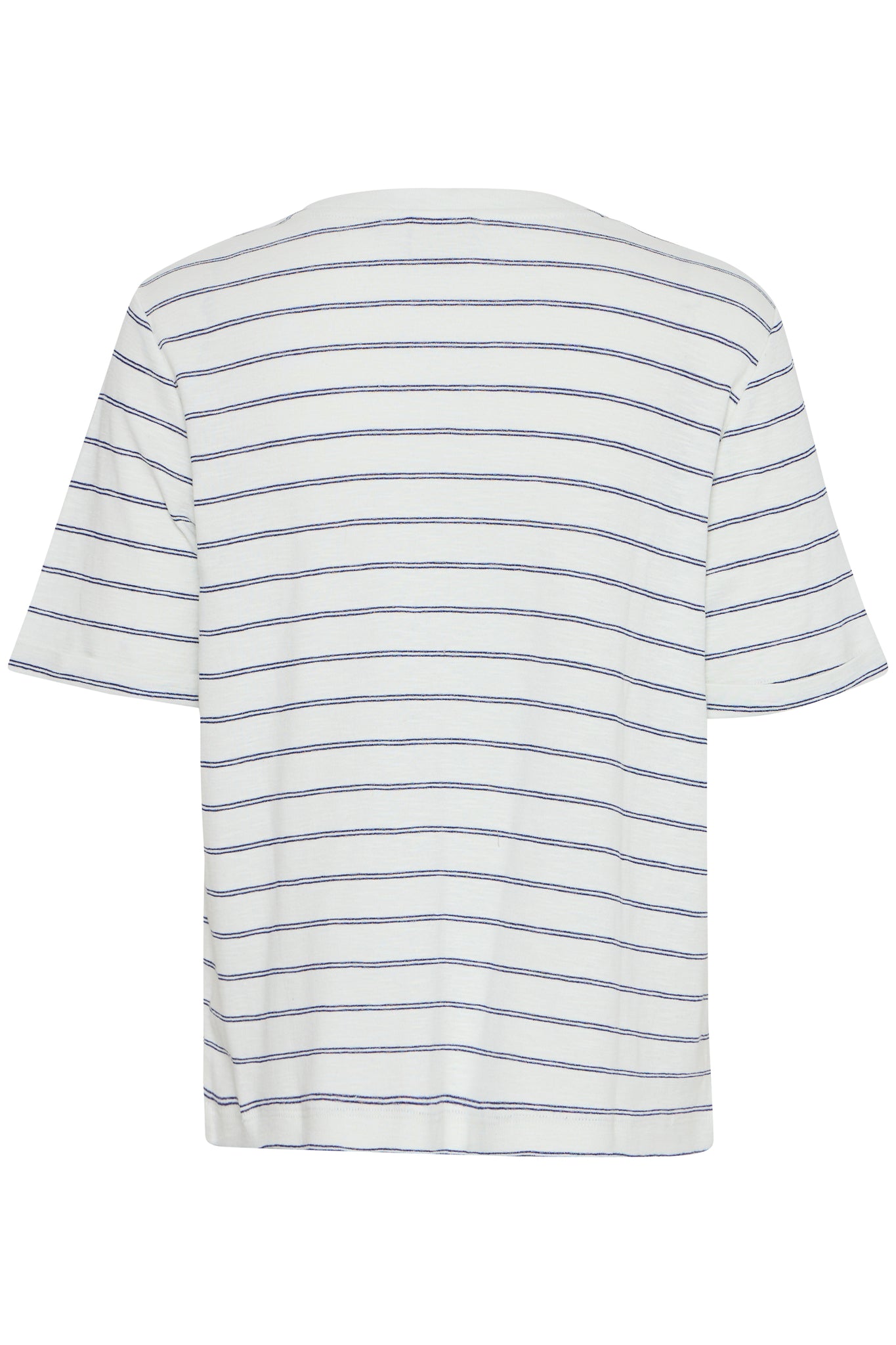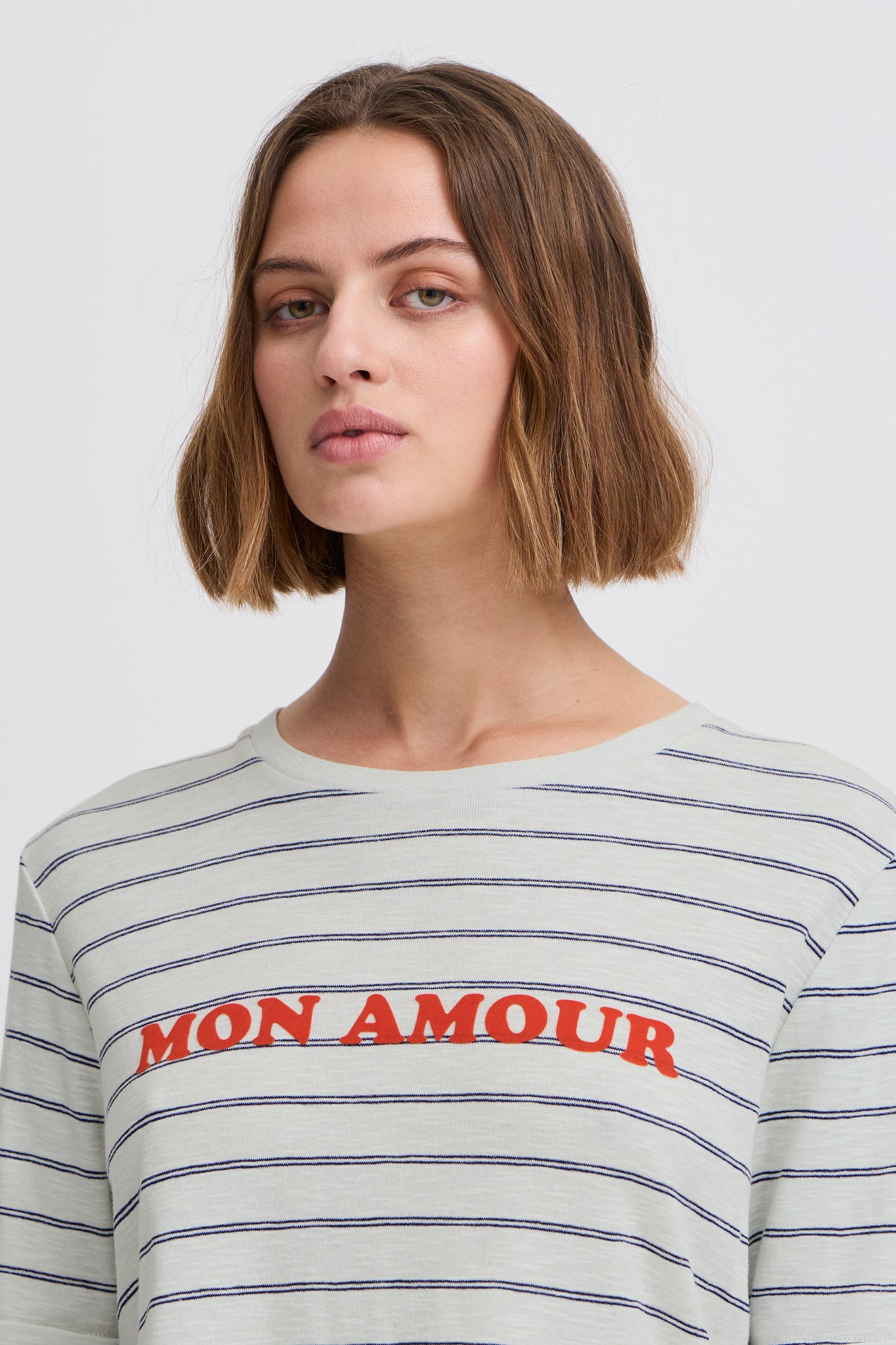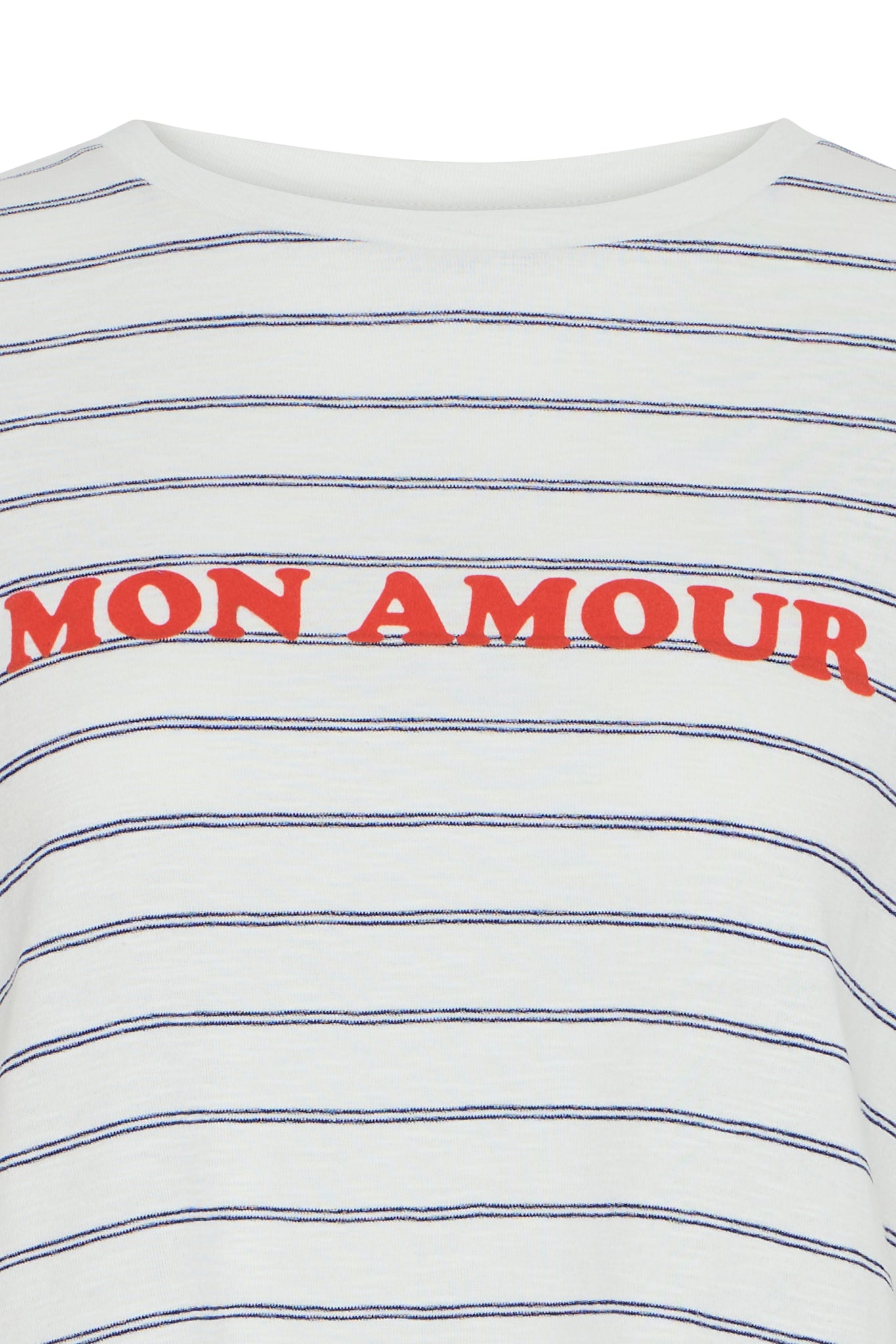This striped T-shirt features a straight, casual fit with a classic crew neckline and short sleeves. A bold front text detail adds a modern twist to a timeless style.