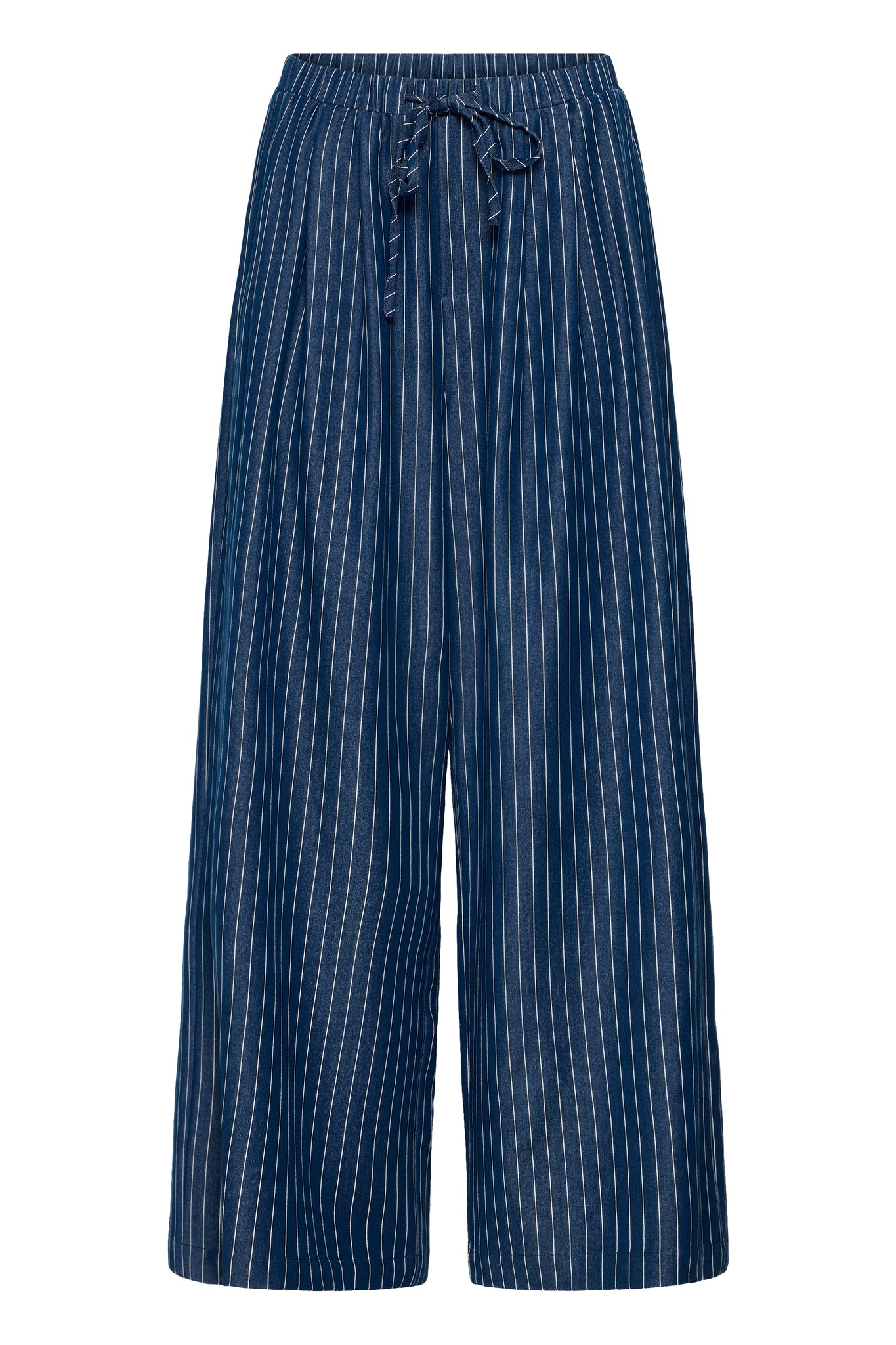 Wide-leg striped trousers with a high elasticated waist and adjustable drawstring, finished in a soft-texture fabric. Full-length silhouette with vertical pinstripes for a streamlined, modern look.