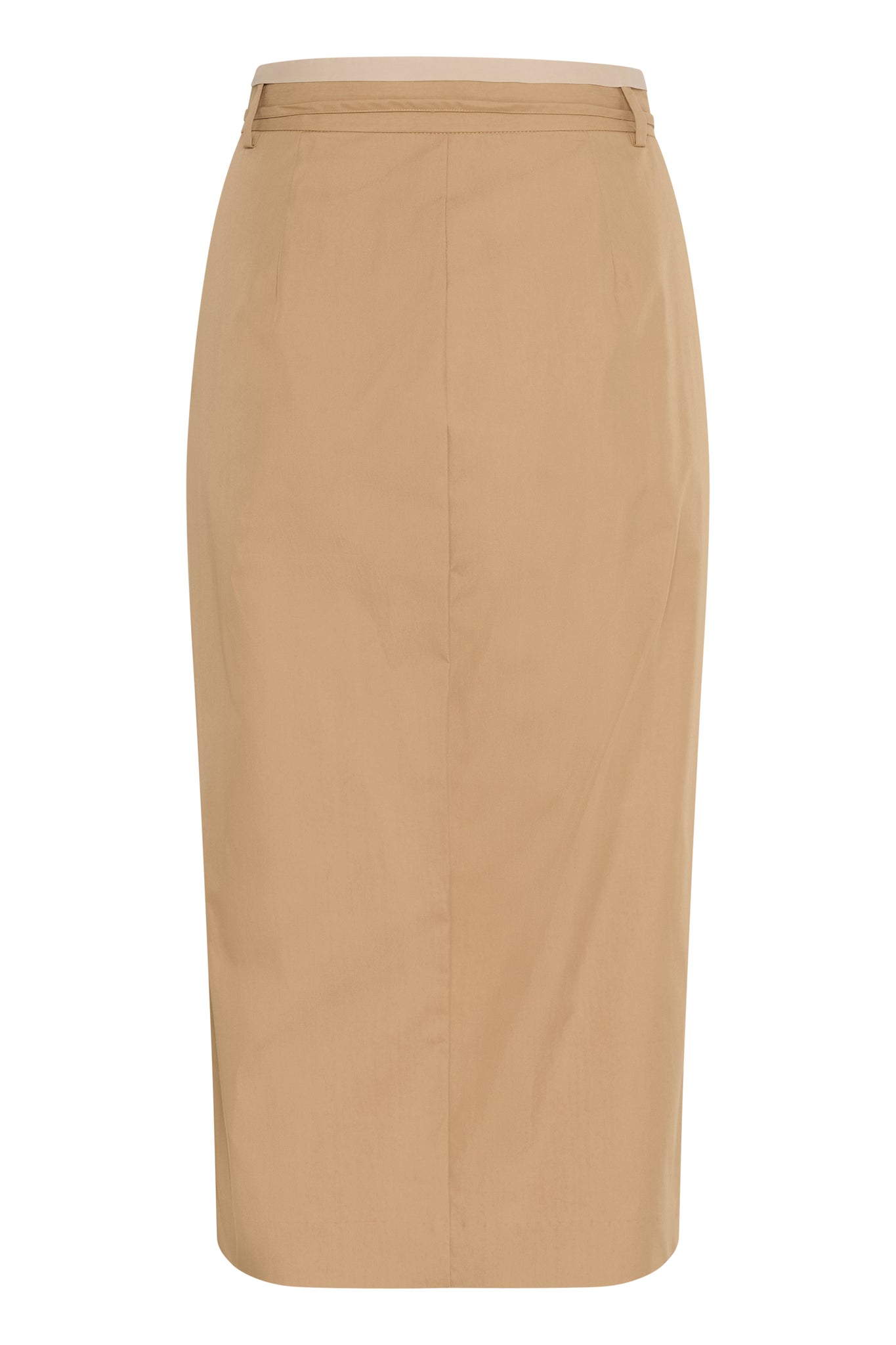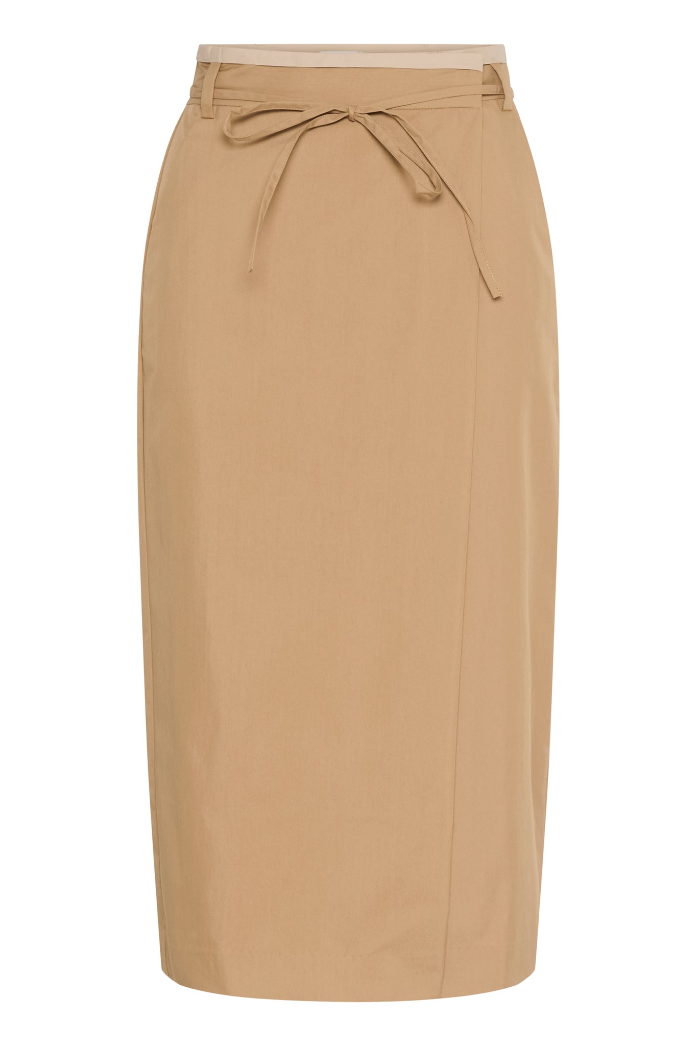This straight midi skirt features a wrap-effect front, subtle tie belt at the waist, and a clean, structured silhouette. Minimal seam detailing creates a refined, modern look with a smooth, soft-textured finish.