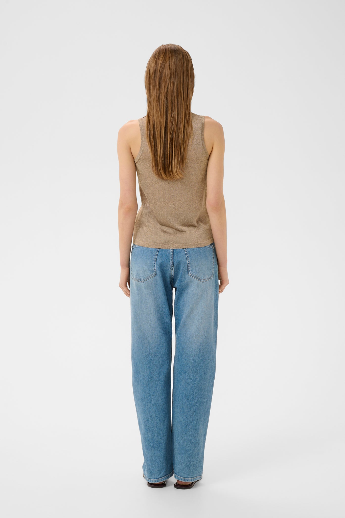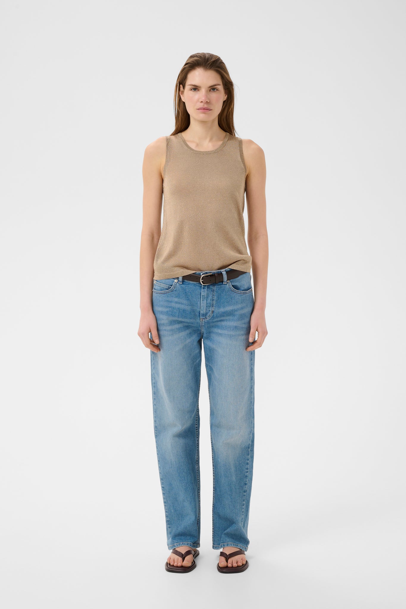 This sleeveless top showcases a straight fit and fine, subtly shimmering texture. Finished with a classic crew neckline and neat edges for a minimal, sleek look.