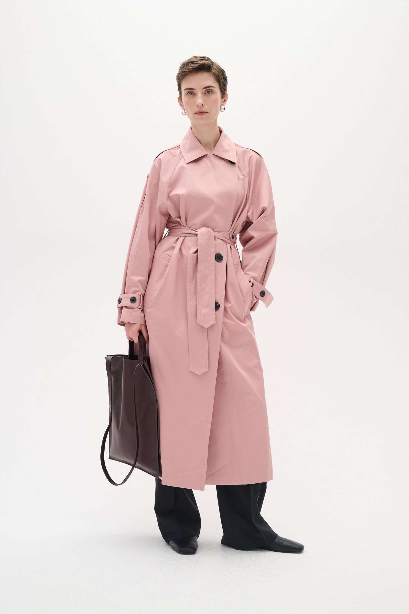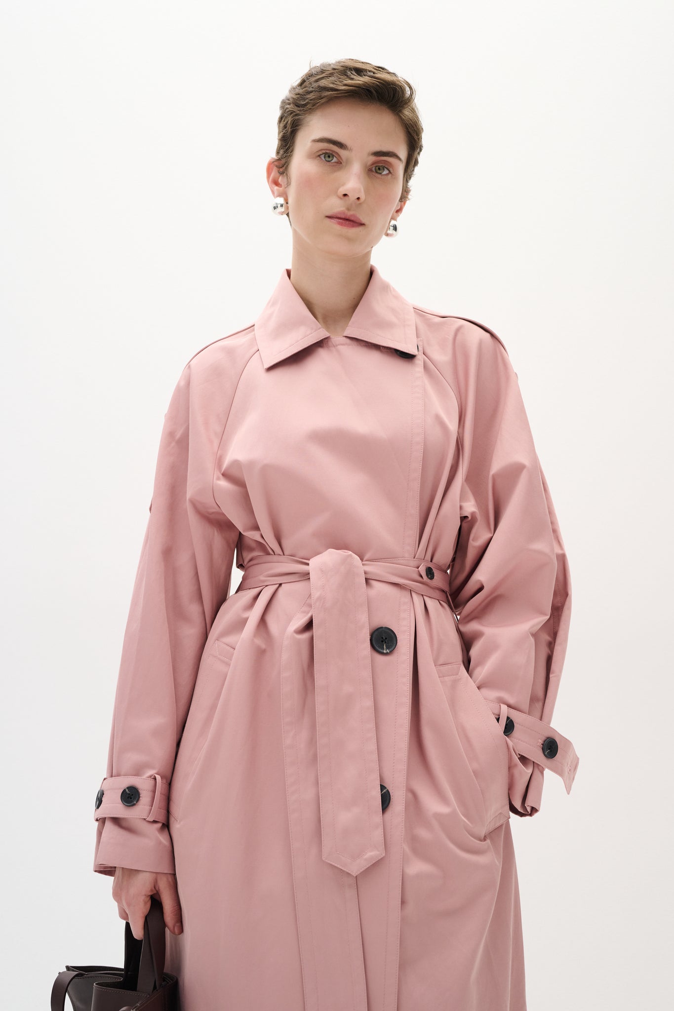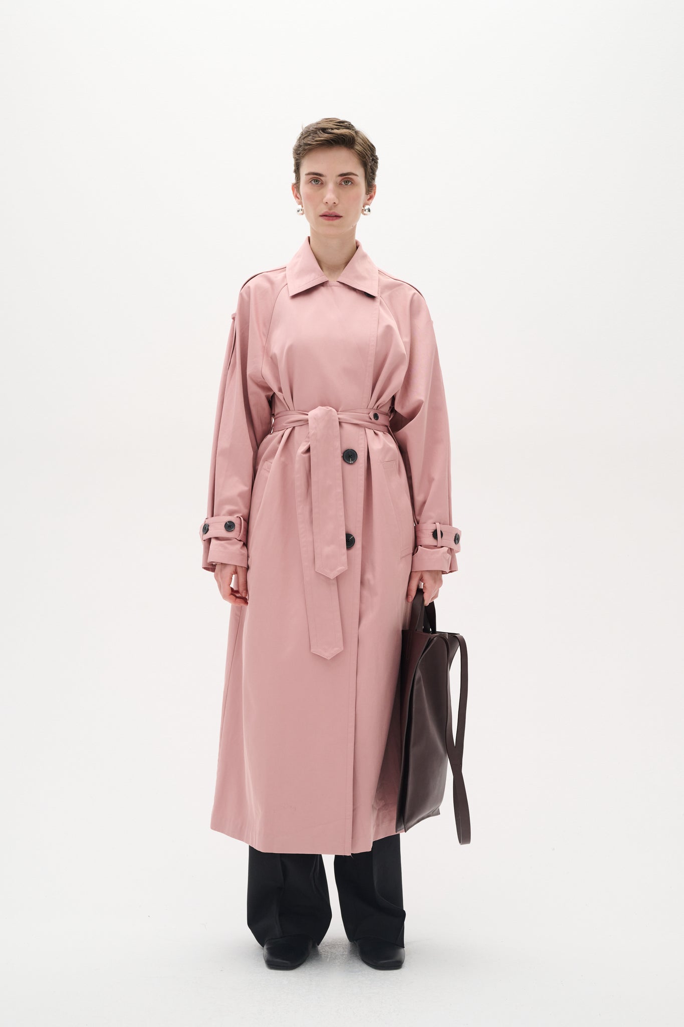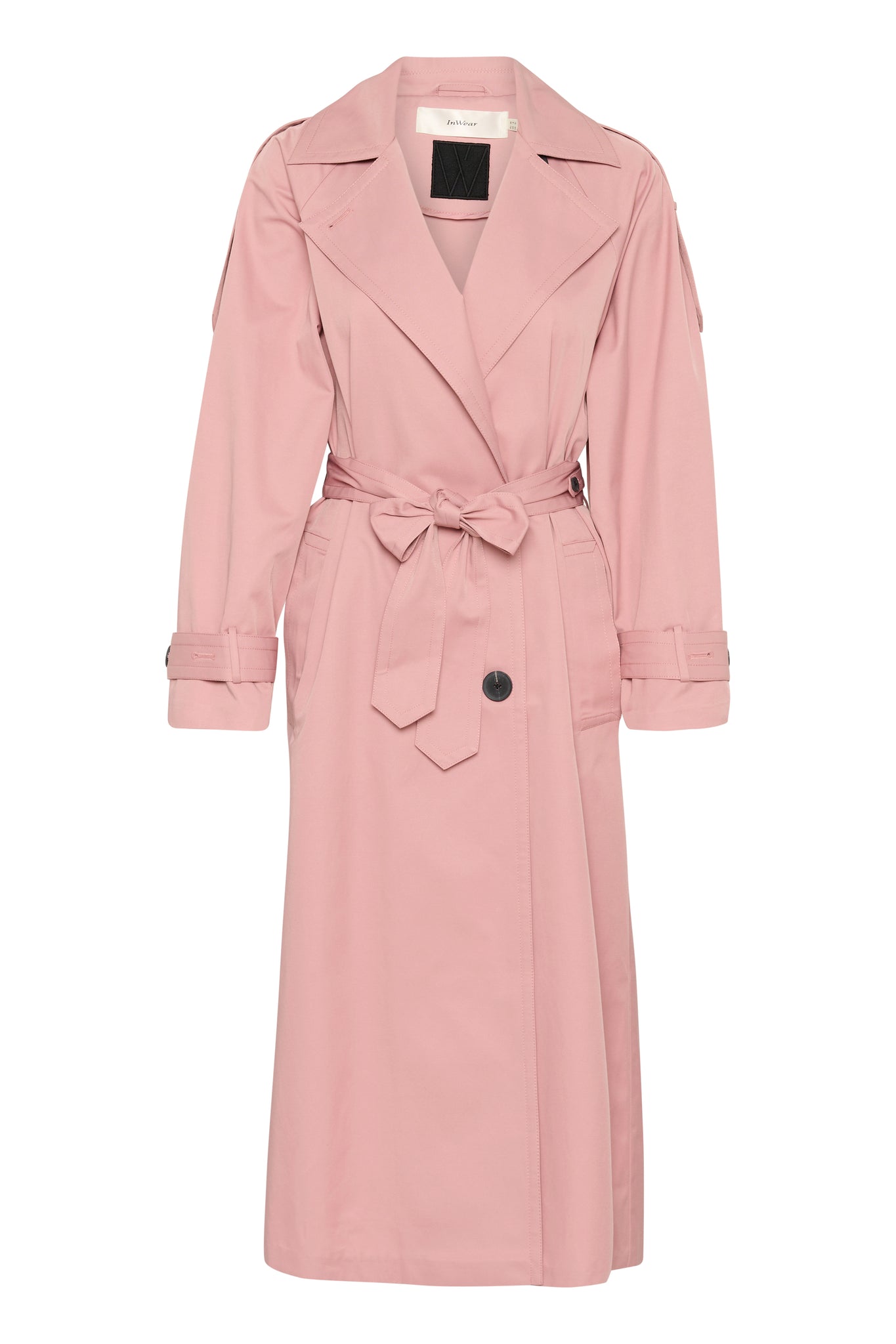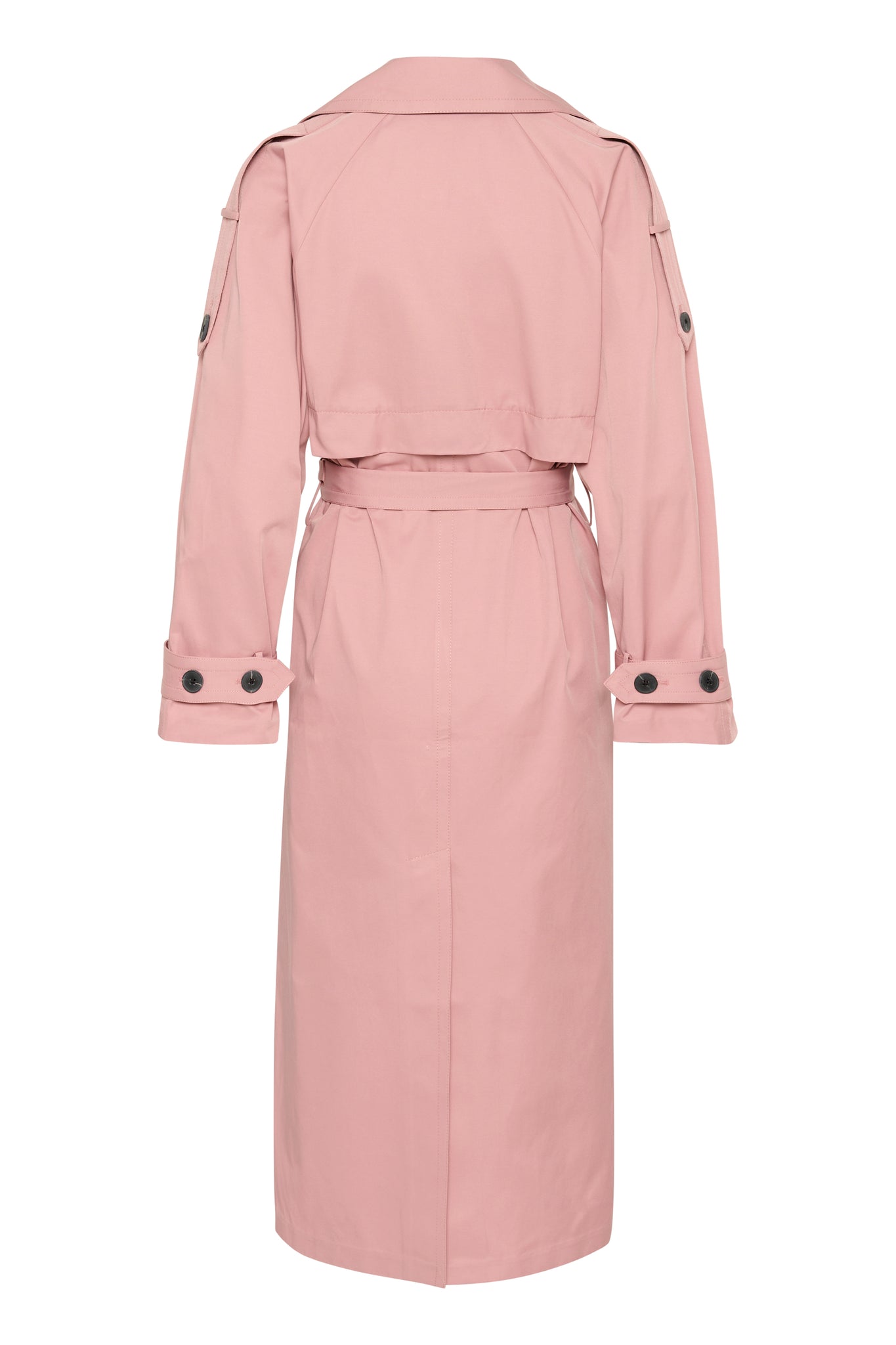 Long trench coat in pink with wide cuffs and large black buttons. The coat features a classic closure, a waist tie, a wide collar, and adjustable straps on the sleeves. The model is 177 cm tall and wears size 36/S.