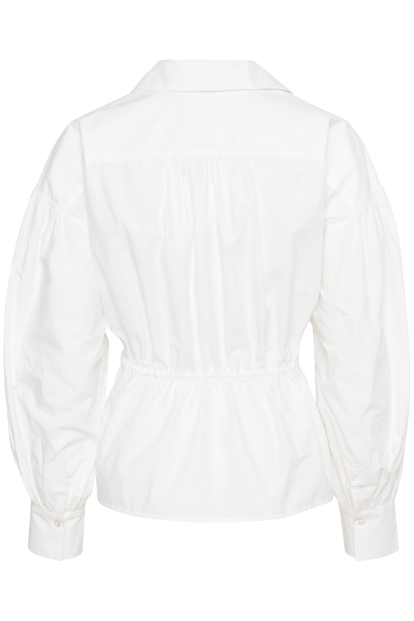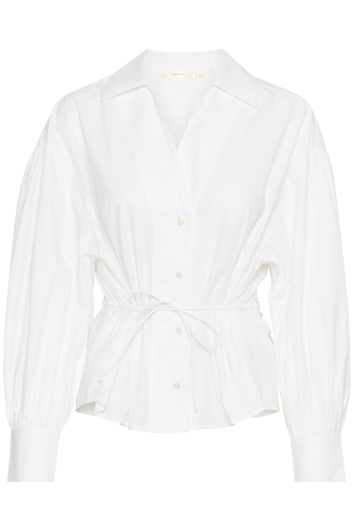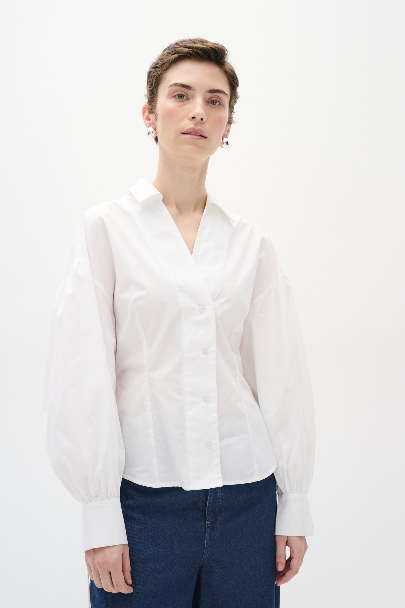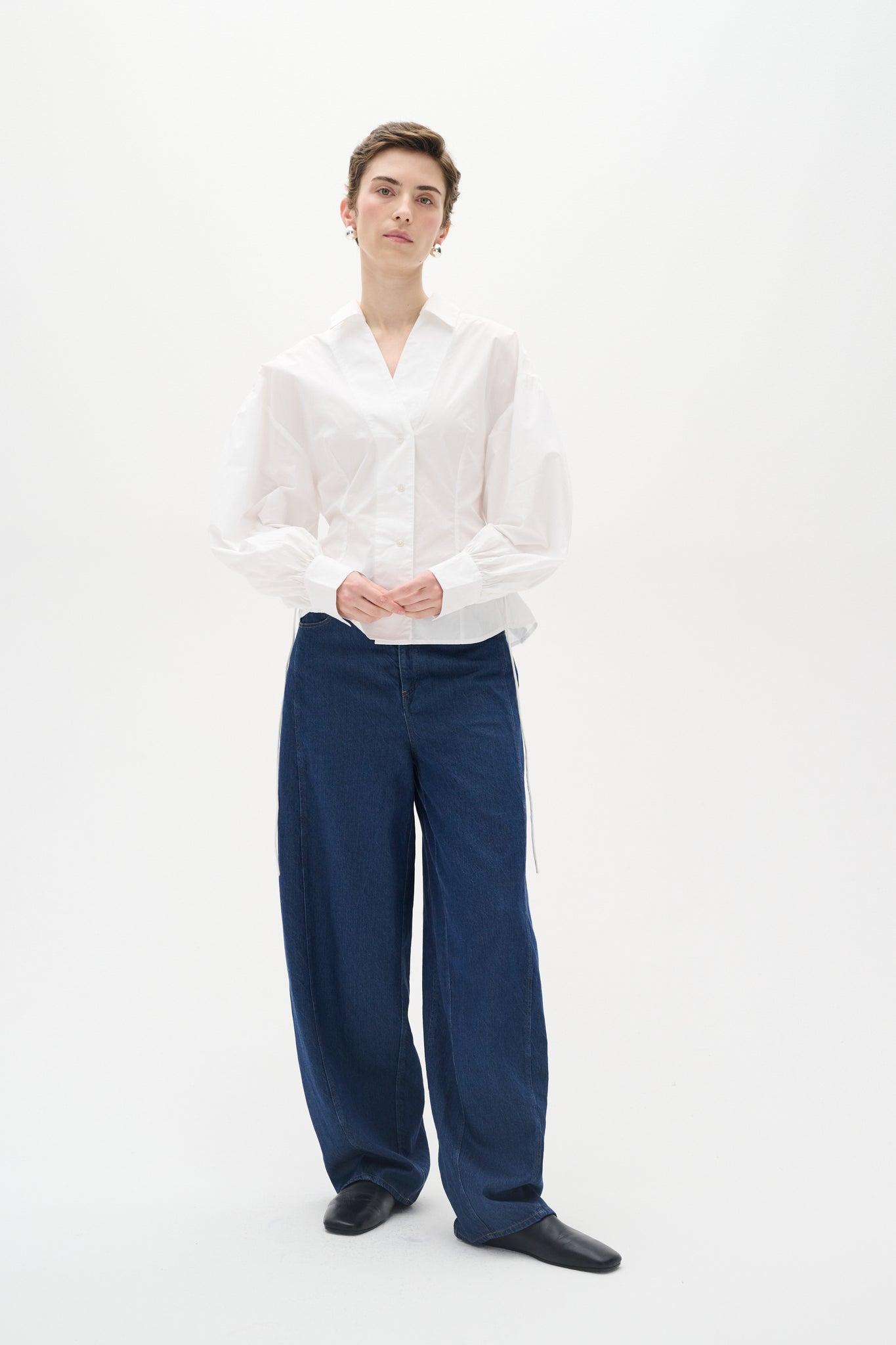 Button-up shirt with a defined waist, featuring a spread collar, long voluminous sleeves, gathered cuffs, and an adjustable drawstring detail for a sharp, structured silhouette.